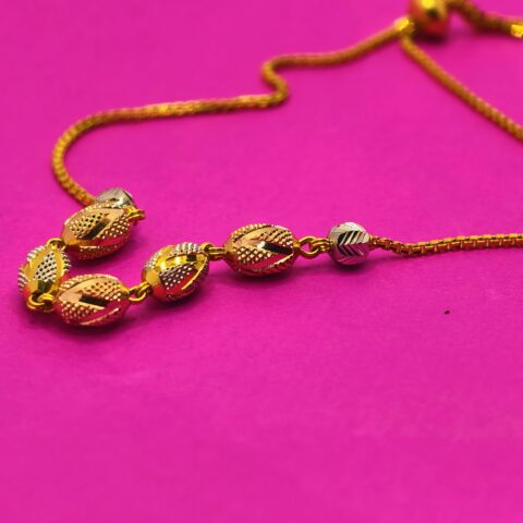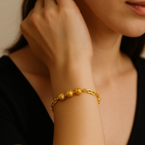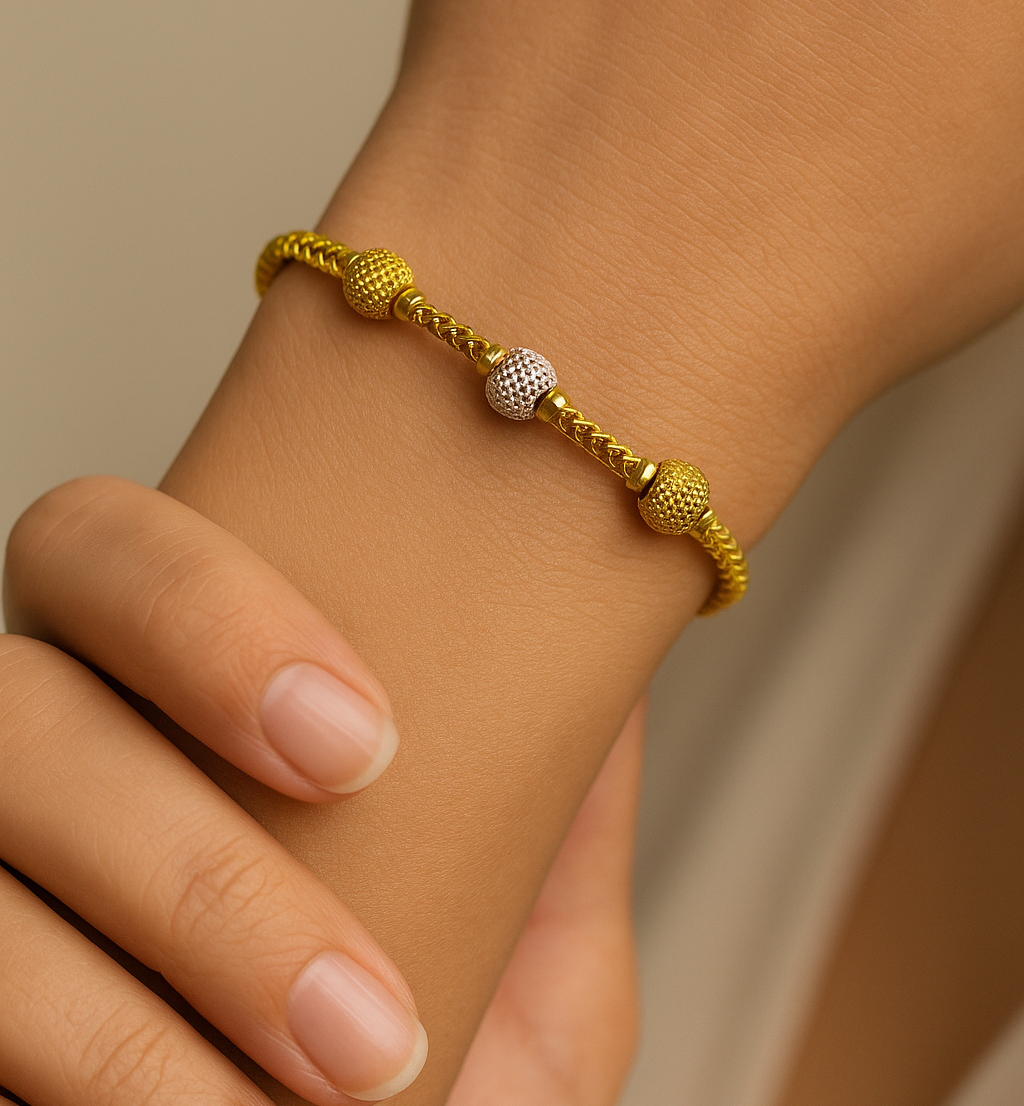 A timeless dual-tone gold bracelet featuring intricately crafted beads in gold and silver tones. Perfect for everyday elegance or special occasions.