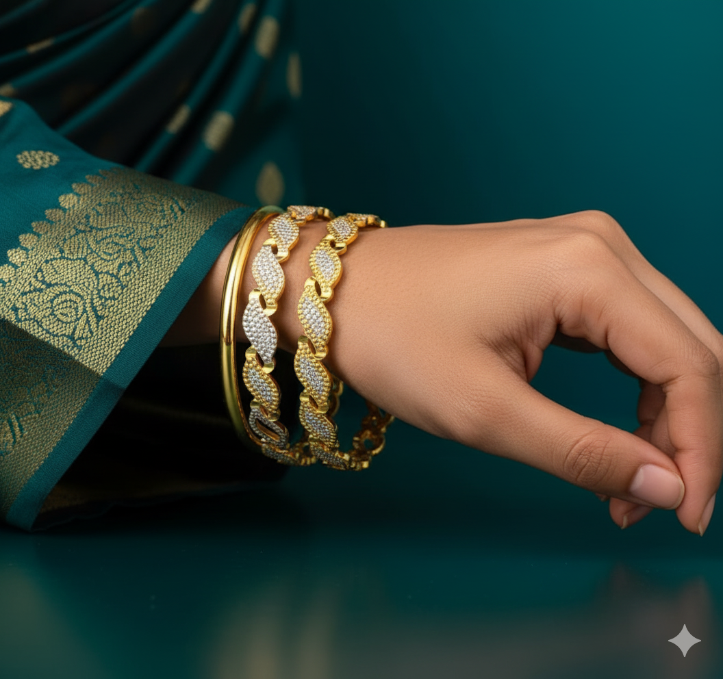Grace meets glamour ✨. These bangles feature a wavy dual-tone pattern with shimmering accents, perfect to complement both festive attire and everyday elegance.