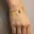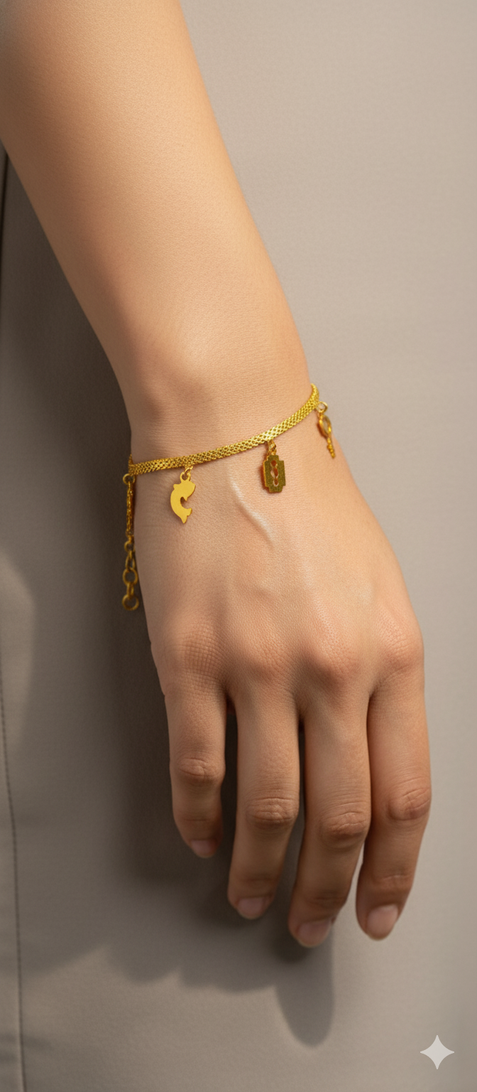 It’s a beautiful gold charm bracelet being worn elegantly on a female wrist, set against a simple, soft background.