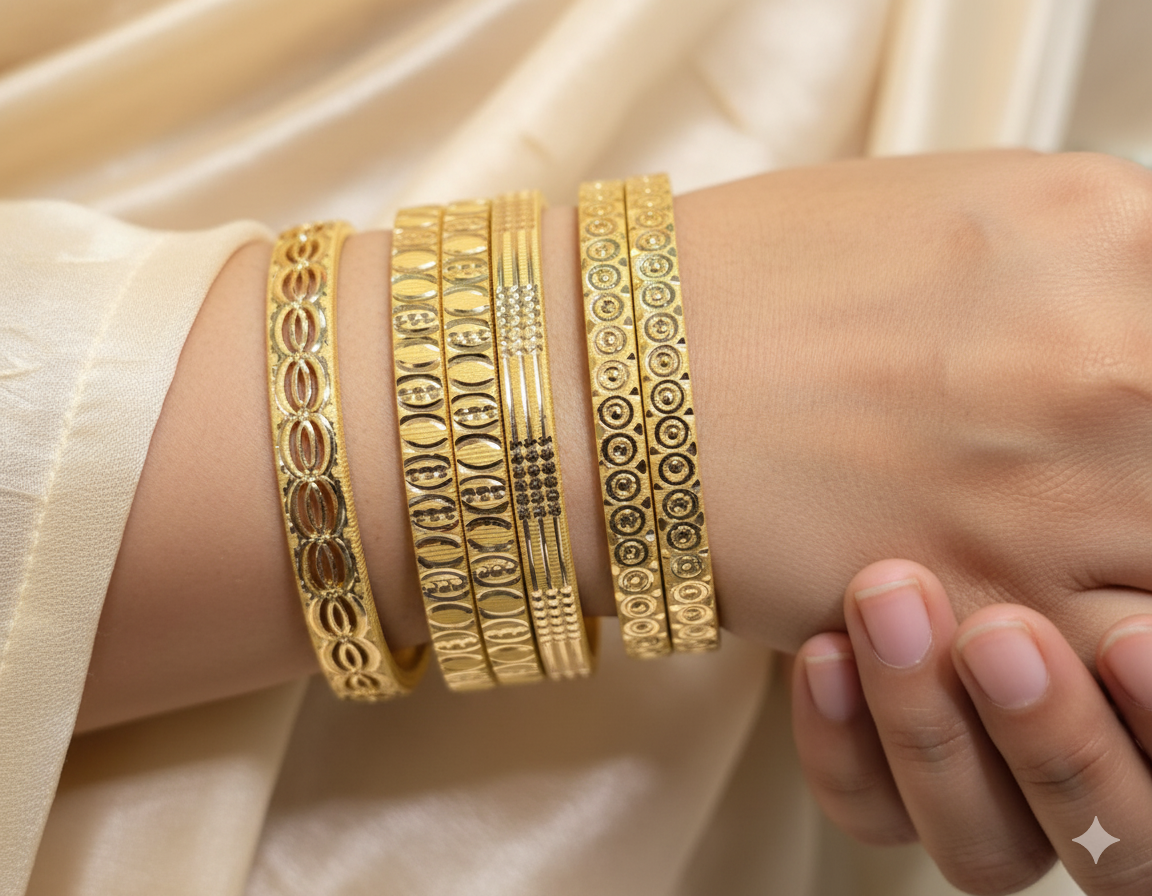 A concise, catchy summary (e.g., Exquisite set of four 22K gold bangles featuring intricate filigree work and a stunning high-polish finish. Perfect for weddings and festive occasions)