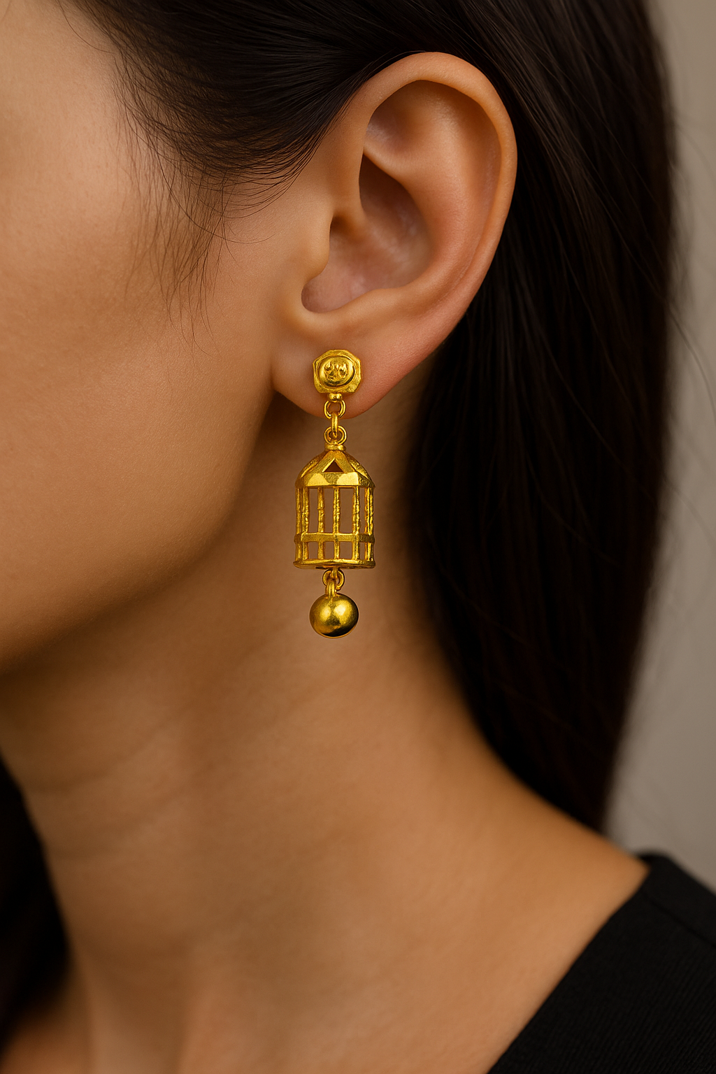 A unique gold earring designed like a delicate birdcage with a dangling bead. Lightweight yet striking, it blends tradition with modern artistry—perfect for festive and everyday elegance.
