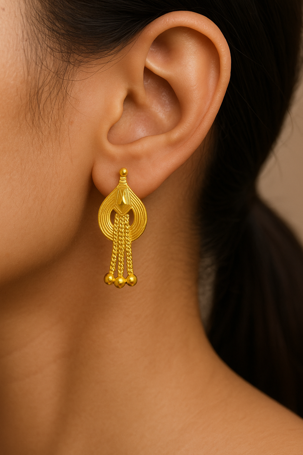 Stylish gold earrings featuring a layered drop design with delicate tassel ends. Lightweight, graceful, and perfect for festive charm or daily elegance.