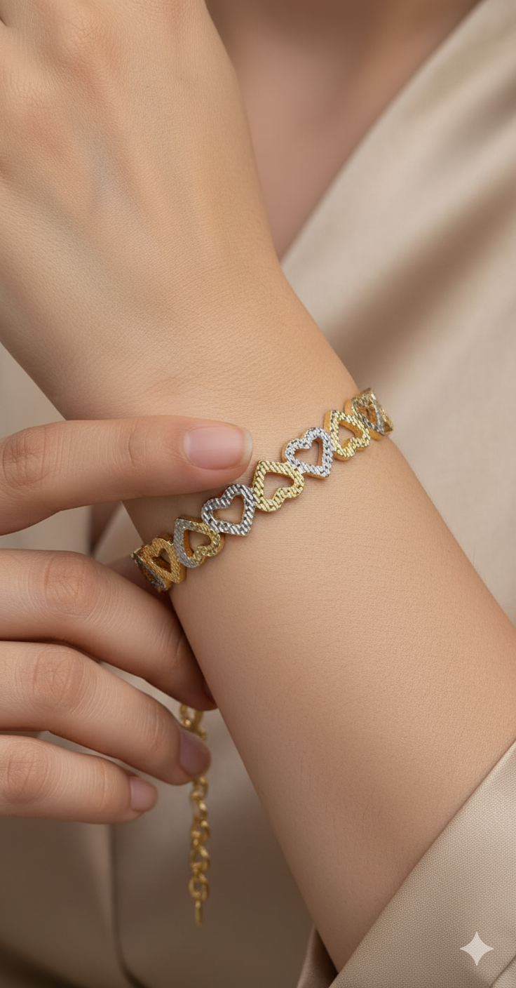 Celebrate love and elegance with our Intricate Heart Link Gold Chain Bracelet. This piece is a perfect fusion of classic romance and modern design, making it an essential addition to any jewelry collection.