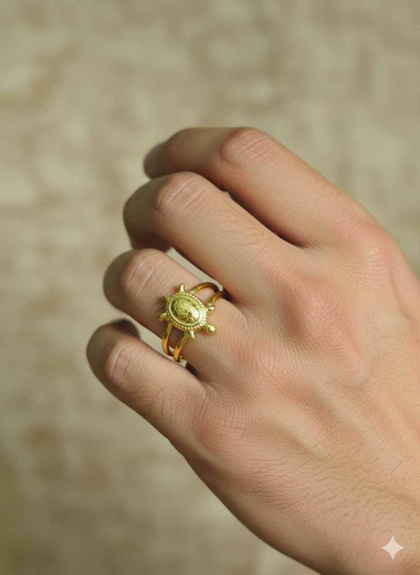 Band Design: The band is unique, appearing to be a double-banded or stacked look beneath the main turtle design, adding a contemporary and substantial feel.